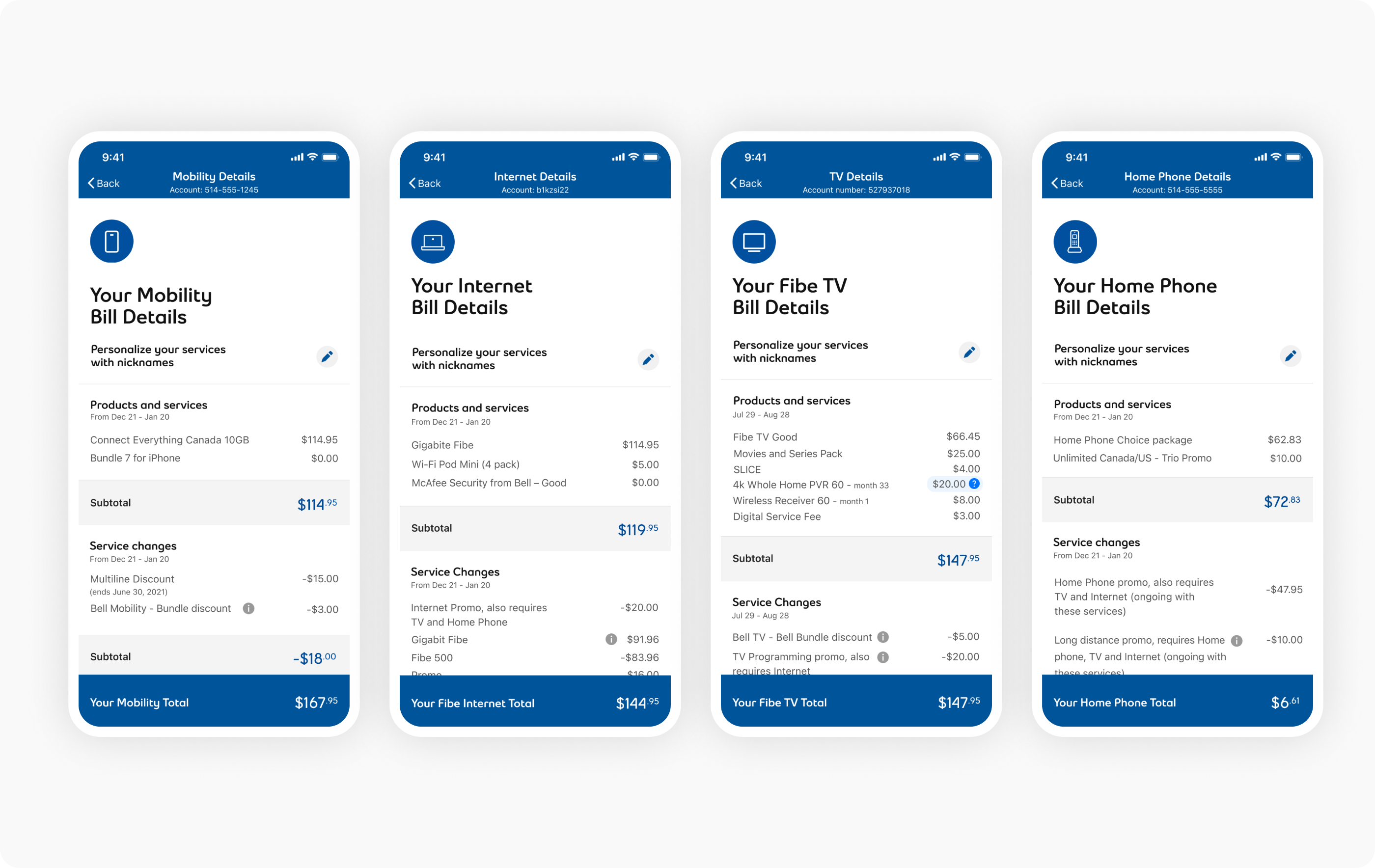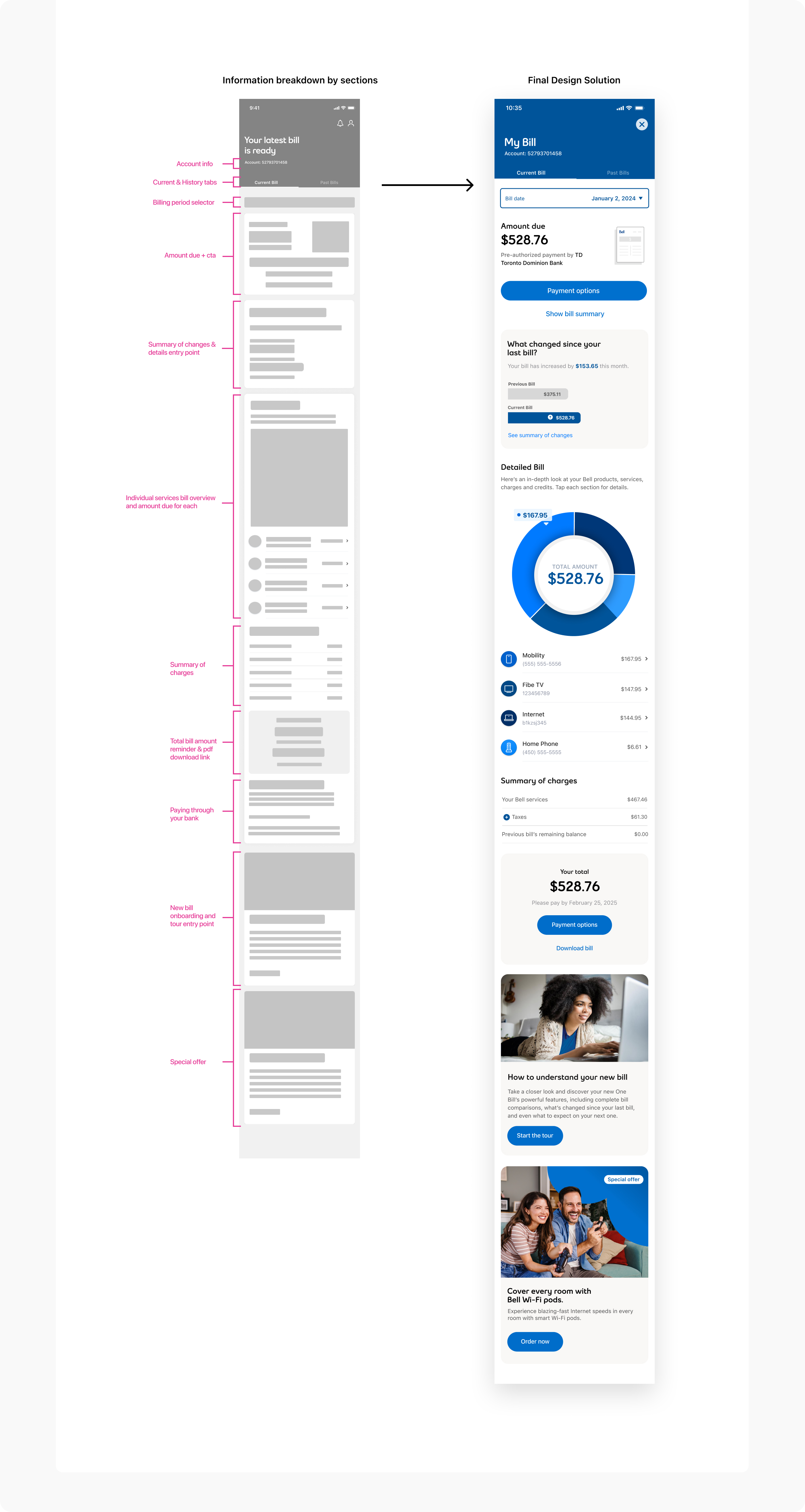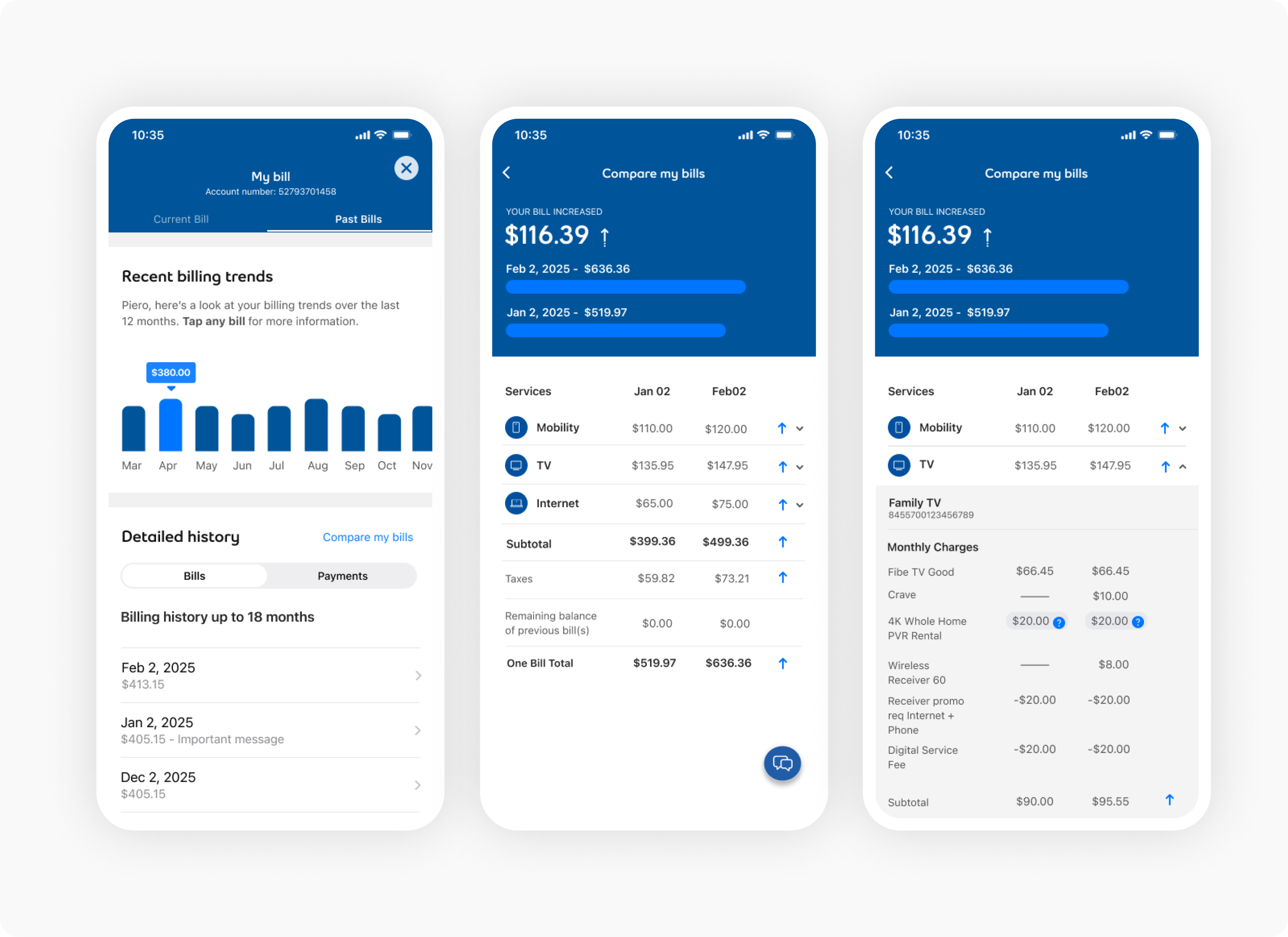 Design of the bill history and comparisons.To extend the value of unified billing beyond static viewing, we designed a comprehensive bill management system that consolidates multiple services (mobile, internet, TV, home phone) into a single, interactive bill view. The unified architecture allows users to see all charges across services in one place, compare usage patterns, and understand their complete billing relationship with Bell.