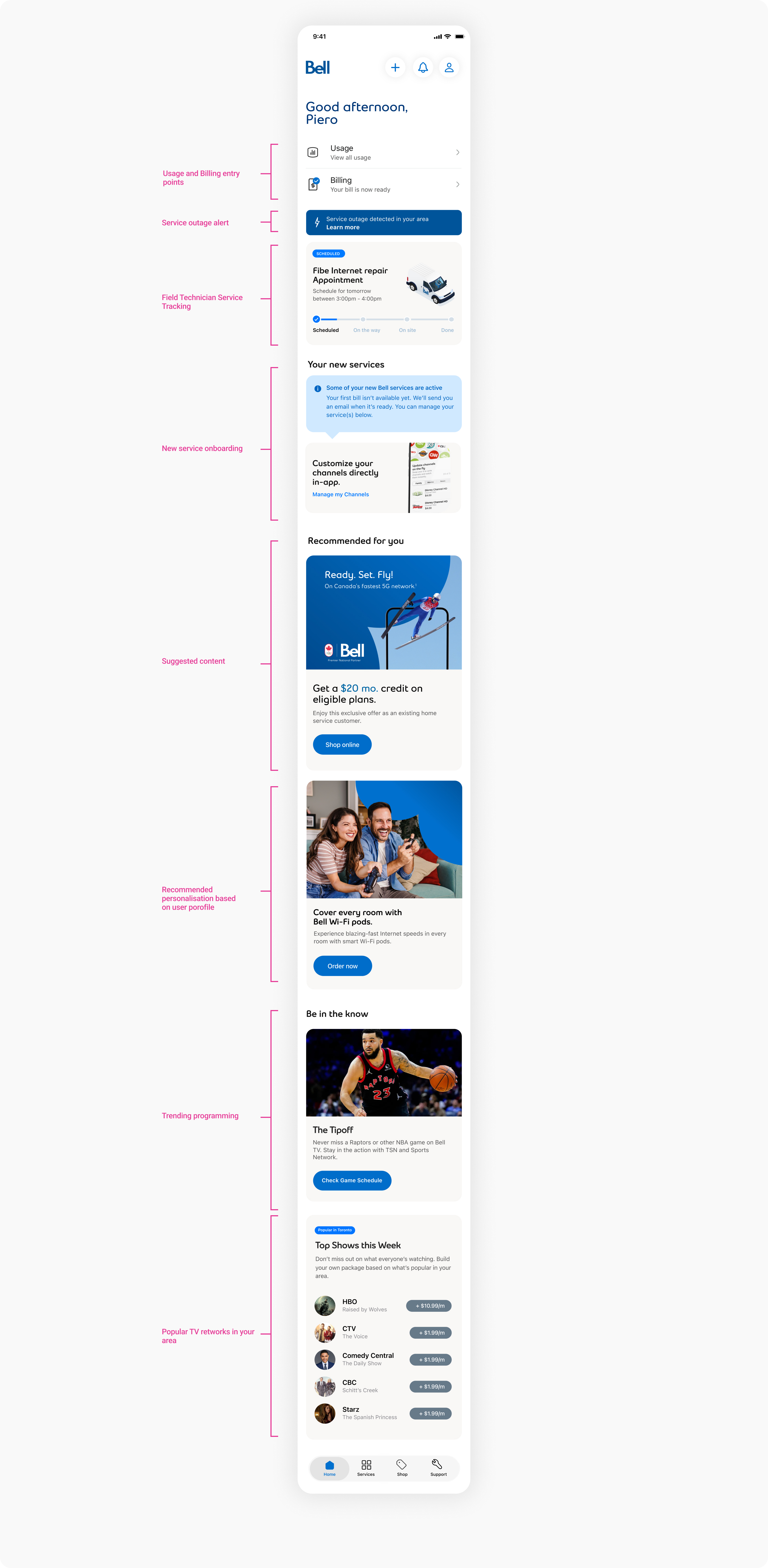 We designed a personalized home feed that transforms Bell's app landing screen from a generic services screen into a personalized, account-aware experience. The feed surfaces relevant content based on user accounts, service usage, and viewing behaviour—enabling service discovery, onboarding, and engagement without support intervention.